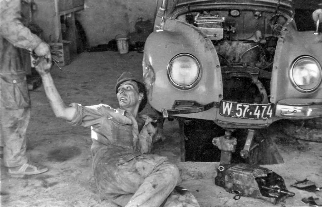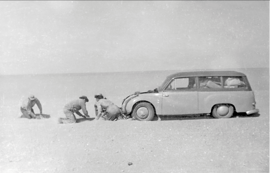 Gegen Morgen zeigte sich am Horizont ein heller Streifen, der die Szenerie der misslichen Lage in all ihrer dramatischen Pracht offenbarte. Der IFA steckte tief im Schlamm, der die Kühlerhaube halb bedeckte. Es sah hoffnungslos aus. Die Gewissheit dämmerte, dass unser ambitioniertes Versprechen, den Wagen heil nach Hause zu bringen, in diesem Moment wie der Morgennebel dahin schwand. Im ersten Licht des Tages machten wir uns daran, das Auto zu entladen und das Material auf der Piste aufzutürmen. Das musste auf jeden Fall gerettet werden. Aber wie? Die Straßensperre, die uns diese Misere eingebrockt hatte, war bei den Einheimischen bekannt, folglich gab es hier keinen Verkehr. Wir bereiteten uns mental auf einen längeren Gepäckmarsch vor. In einer rational nicht zu begründenden Anwandlung kletterte ich zurück in den IFA und drehte den Zündschlüssel. Der Motor sprang bei der ersten Umdrehung des Anlassers an und reagierte auf das Gaspedal! In schweißtreibender Arbeit brachten wir mit Motorkraft und Manpower das Fahrzeug wieder auf die Piste. Mackie und Kopecky erkundeten die Umgebung und fanden kurz vor der Barriere eine Abzweigung, die in den Busch führte und bei Dunkelheit nicht zu erkennen war. Die könnte unsere Rettung sein. Autofahrer in Afrika suchen Hindernisse und Absperrungen zu umfahren und legen dabei eigene Fahrspuren an. Kopecky zauberte aus einem seiner Gepäckstücke die lange vermisste Flasche Rossbacher Magenbitter hervor, die reihum ging. Niemand war ihm böse.