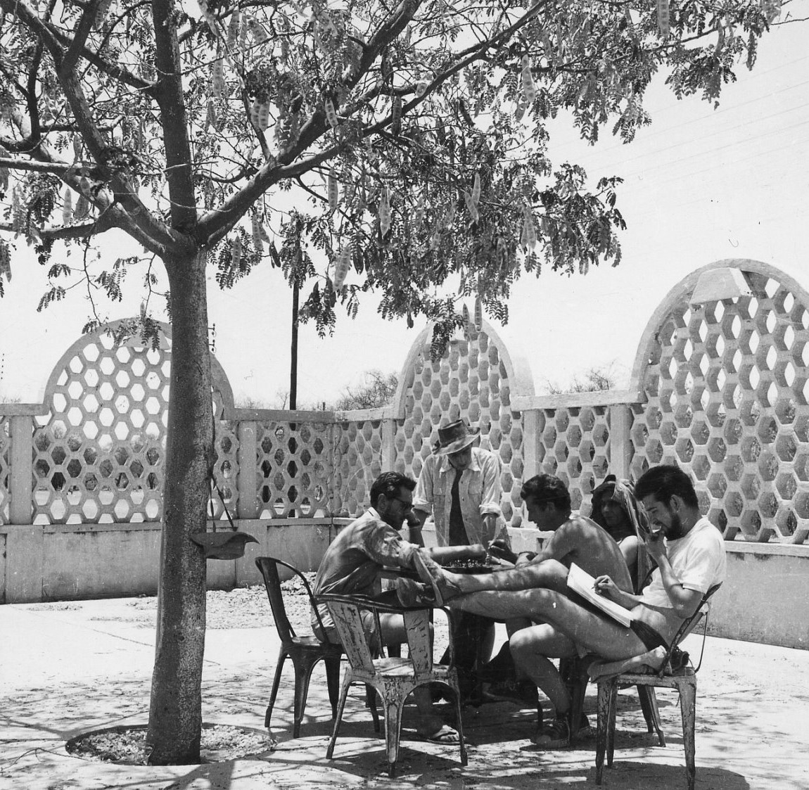 Wir wurden gebeten, ihm unsere Adressen zu diktieren. Der Prinz aber zeigte vor uns einen derartigen Respekt, dass wir ihm die Angaben auf etliche Meter zuzurufen hatten. Das Buchstabieren über die Entfernung gestaltete sich mühsam, so klärte Schani die Situation, indem er freundlich bat: “Wollten Eure Hoheit nicht ein wenig näher rutschen?“ (Ein Satz, den wir bis zu unserer endgültigen Heimkehr oft als erheiternden running gag gebrauchten.) Seine Prinzenhoheit schlich heran und wir nahmen die Eintragungen selber vor. Unterdessen gab König Aho einige Befehle, die wir nicht verstanden. Kaum war der Prinz verschwunden, öffnete sich der Türvorhang und etwas verschämt zögernd, erschienen die 40 Schönen des Palastes. Auf einen Wink AHO’s platzierten sie sich hinter seinem Sessel.