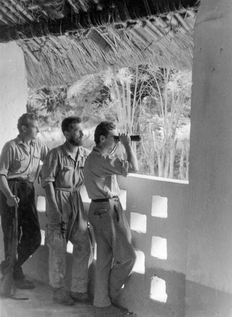 Die Missionare, die durch unsere Erzählungen die Anliegen des Unternehmens kannten, erzählten uns von einer weiteren Missionsstation in Sinendé, die Interessantes für uns bieten könnte. Spät am gleichen Tag fuhren wir los. Die Strecke war recht gut befahrbar, bis zu dem Moment, an dem sich ein unvorstellbares Gewitter über uns entlud. Bis es sich verzogen hatte, war finstere Nacht hereingebrochen, und wir beschlossen diese an Ort und Stelle zu verbringen. Logischerweise unter freiem Himmel. Eine Entscheidung, die sich schnell als fatal erwies. Da unsere Moskitonetze dem Übergewicht geopfert wurden, waren wir den Myriaden von Moskitos schutzlos ausgeliefert. Wir flüchteten in das Innere des IFA. Man stelle sich die Luft in einem Auto der unteren Mittelklasse, eine ganze Nacht von vier Männern und einem Äffchen besetzt, bei einer Außentemperatur von etwa dreißig Grad Celsius und geschlossenen Fenstern vor. Wir vertrieben uns die Zeit bis zum Morgengrauen mit Abwehren von geschätzten hundertfünfzig von draußen mitgebrachten Moskitos, die selbst Joko fast zum Wahnsinn brachten.