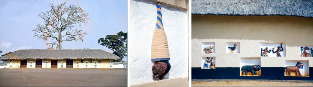 Gegen zwei Uhr erhob sich seine Majestät und erklärte, dass er uns rasch die Reliefs zeigen und erklären wolle, bevor er sich zu seiner wohlverdienten Mittagsruhe zurückziehe. Die plastischen Wandbilder, die wir nun bewundern durften, stellten nicht etwa eine fortlaufende Geschichte des Hauses dar, sondern einzelne Ausschnitte und Begebenheiten sowie symbolhafte Figuren. Vor einem Bild verharrte der König länger. Es zeigte den Kopf eines schwarzen Mannes, der anscheinend einen hohen spitzen Hut trug. In Wirklichkeit verhielt sich die Geschichte aber so: Einmal hatte ein prahlerischer Krieger der Yoruba überall ausposaunt, er werde den König von Abomey fangen und grausam richten. Sein Plan war, dem König den Kopf abzuschlagen, ihn in einen Hirsemörser zu legen und zu Brei zu zerstampfen. Der König erfuhr von den Prahlereien dieses Yoruba. Majestät waren empört und sandte Krieger aus, besagten Mann lebendig vor den Thron zu führen. Wochen später war der Auftrag erfüllt. Der König sprach ein salomonisches Urteil: „Wie du mir, so ich dir.“ Man zerstieß seinen Kopf in einem Mörser, aber ohne ihn vorher abgeschlagen zu haben. Der spitze Hut auf dem Relief stellte den Hirsestößel dar. Aber nicht alles, was die Palastmauern schmückte, war so blutrünstig. Da waren die schönsten Symbolfiguren. Vor einem Relief, das ohne Zweifel einen Büffel darstellte, verweilten wir ebenfalls. Unerklärlicherweise aber hatte dieses Tier ein rotes Beinkleid an. Der König erklärte das so: Es ist genauso unmöglich, einem Büffel eine Hose auszuziehen, wie den Herrscher seiner Macht und Würde zu entkleiden.