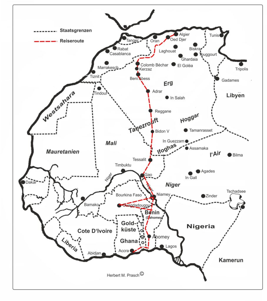 Mit etwas mulmigen Gefühlen, doch mit Vorfreude erfüllt, bin ich vor sechs Tagen allein im fast neuen Landrover zur Durchquerung der Sahara über die Tanezrouft-Linie, der Route National Nr. 6 gestartet. Vor etwa sechzig Jahren kannte ich die Strecke „wie meine Hosentasche“. Diese Piste hatte ich fünfmal befahren, sowohl vom Norden nach Süden als auch umgekehrt. Die Orientierung war damals vermittels von Anhöhen, Sanddünen oder abgestellten „Bidons“ (Benzinfässern) problemlos. Eine genaue Standortbestimmung war mit Hilfe einer Landkarte ebenso präzise möglich, wie heute mit GPS. Aber Beträchtliches hat sich seit meiner letzten Fahrt durch die Sahara verändert, als es strenge Sicherheitsregeln gab. Niemand verwehrt mir als Einzelperson die Einfahrt, die Piste ist fast durchweg asphaltiert, allerdings ungepflegt und streckenweise von Sand verweht. Genau genommen eine langweilige Fahrt.