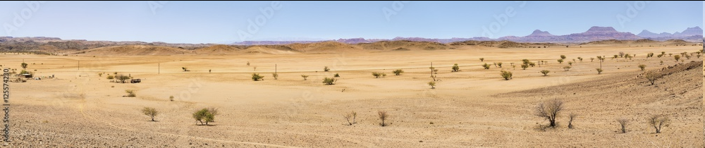 Seit den frühen Morgenstunden bin ich völlig allein auf der Piste unterwegs gewesen. Jetzt begegne ich einem einsamen Targi mit zwei Kamelen, der mir aus östlicher Richtung entgegen kommt. Um ihm die von mir aufgewirbelte Staubwolke und Steinschlag zu ersparen, lenke ich den Landrover von der Piste weg und wechsle in die flache Wüste, wo langsameres Tempo möglich ist. Wieder zurück auf der Hauptstrecke erreiche ich den Aussichtspunkt. Doch dieser bietet nichts Außergewöhnliches.